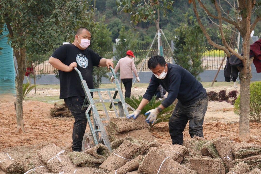 3月16日,在通城縣實驗學校,記者看到工作人員正在分頭忙碌著,有的運送草皮,有的種植樹苗,一派緊張有序、如火如荼的施工場景。